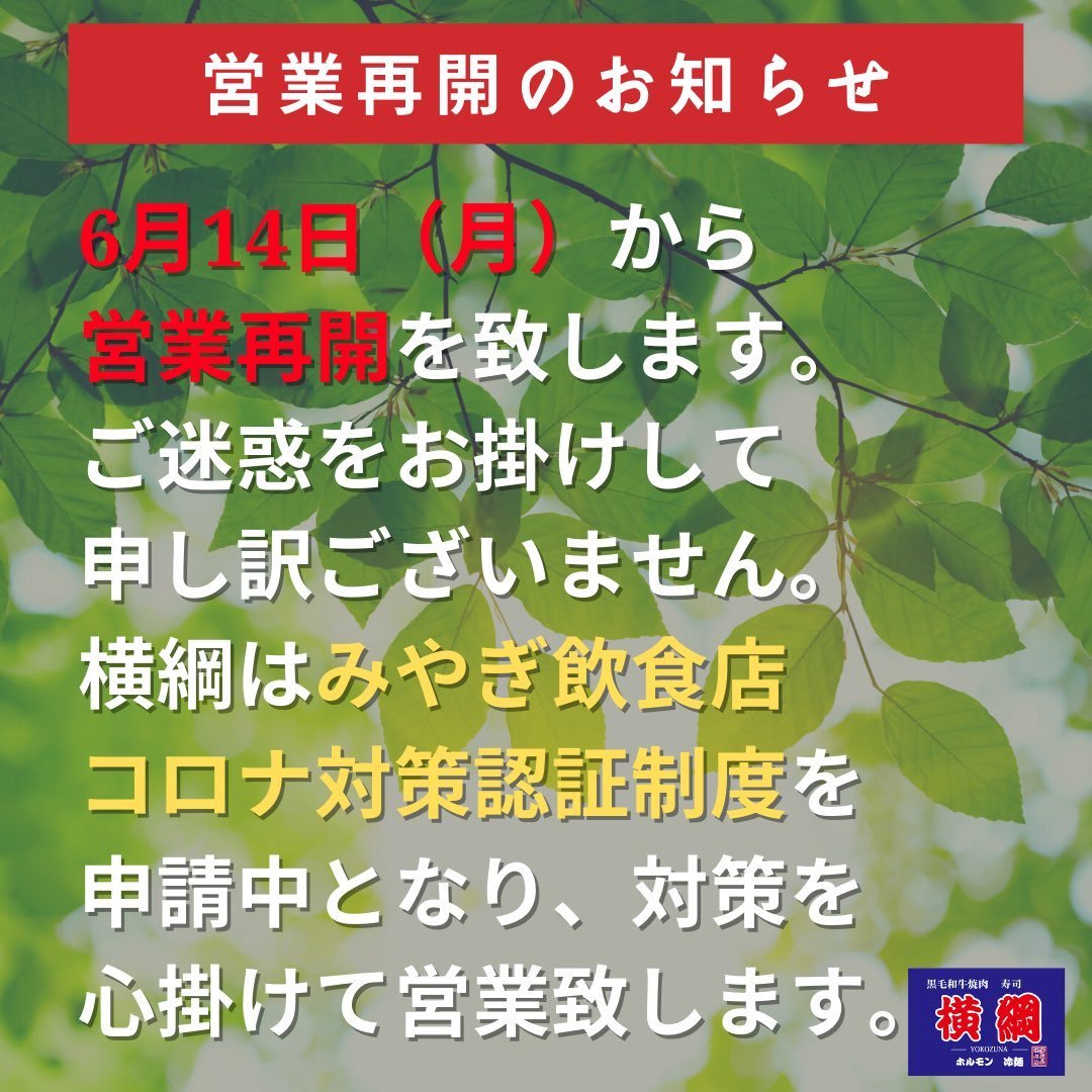 現在、横綱はみやぎ飲食店コロナ対策認証制度を申請中となり、コロナ対策を心掛けて営業していく準備をしております😀