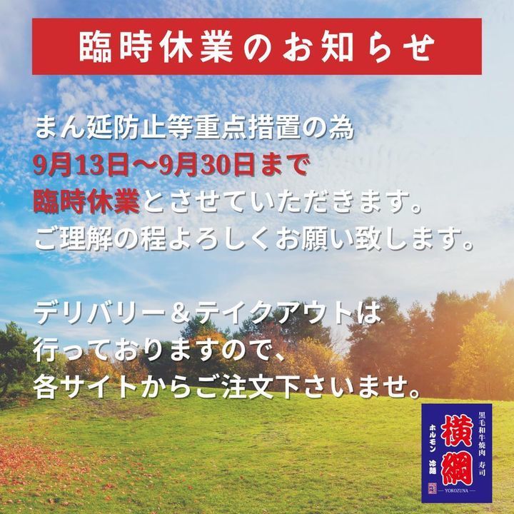 まん延防止等重点措置の為、9月30日まで臨時休業とさせていただきます。